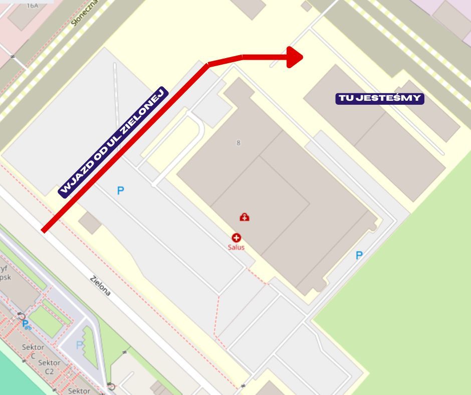 Dojazd przez bramę SALUSa od ulicy Zielonej – do samego końca prosto, a następnie w prawo za płotem.